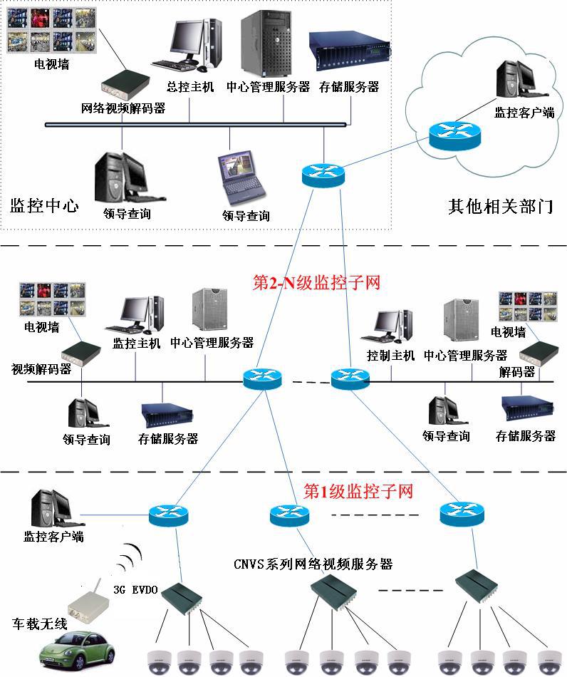 根据视频监控业务方面的要求,我们采用3G网络化分布式视频接入、集中控制管理、分布式共享的策略采用无线通讯方式来实现视频监控功能。