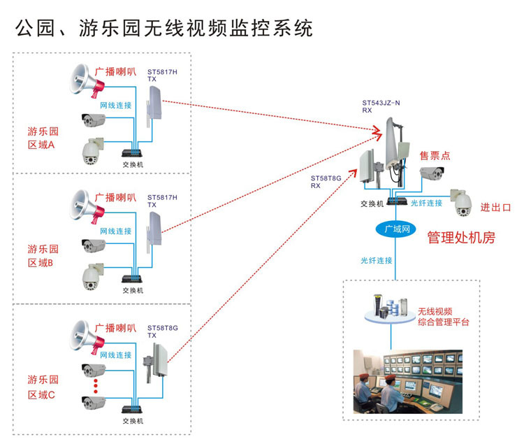 针对园区大范围、复杂环境的特点,常用5.8G无线网桥(如ST58T8GST5817HST543JZ-N等型号)作为核心传输设备,负责音视频数据的高效发送与接收。设备通过网线或光纤连接交换机,构建稳定的传输网络。