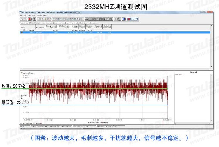 以上两张图是同一款300M无线网桥,分别在2.4G和2.3G频道跑带宽的测试结果图。从图上数据显示可以看出,图一的波动幅度很大,“毛刺”特别多。图二明显比图一稳定,一直保持者良好的传输状态,信号非常稳定。